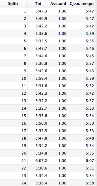 Trøsten er at jeg har løpt 670 meter lengre enn enn en maratondistanse og likevel snek meg under fire timer. Fornøyd også med gjennomsnittsfarten på 5.35 - da vet jeg at jeg kan gått ut omtrent med den farten, eller litt kjappere, ved neste anledning.